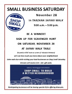So mark your calendars for November 25 – the Saturday after Thanksgiving – and get ready to Shop Small® with us. Grab a friend or family member and come by the Tarzana Safari Walk table near the AT&T store on Ventura Blvd. on the big day.