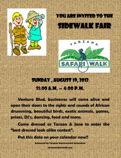 Sunday , August 19, 2012 11:00 a.m. — 4:00 p.m. Ventura Blvd. businesses will come alive and open their doors to the sights and sounds of African drumming, beautiful birds, exotic animals, games, prizes, DJ’s, dancing, food and more.Come dressed as Tarzan & Jane to enter the "best dressed look alike contest".